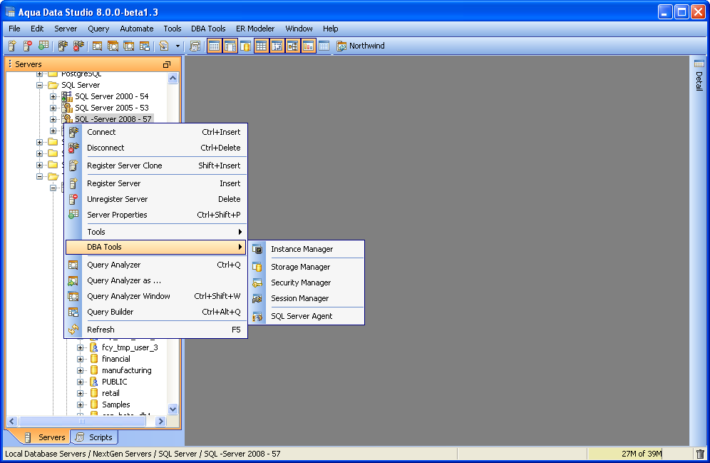 MS SQL DBA Tools The MS SQL Database Administration (DBA) Tools provide users with the tools to administer, manage and monitor all aspects of a MS SQL database. The tools may be accessed from the application DBA Tools menu or from the schema browsers context sensitive popup menu. The following is a list of tools provided with a description of each tools functionality.