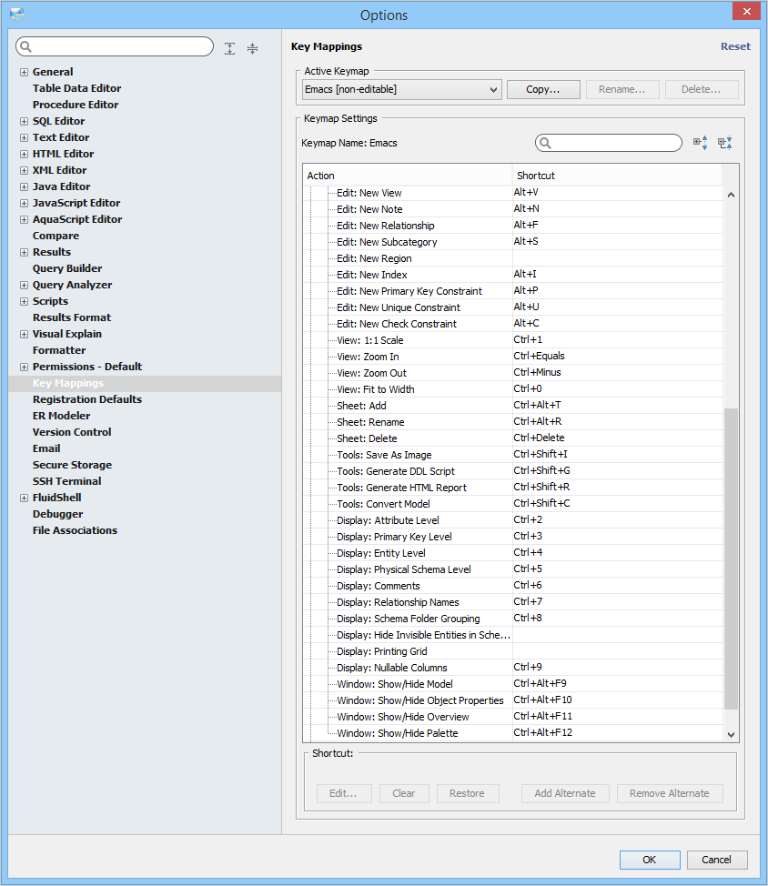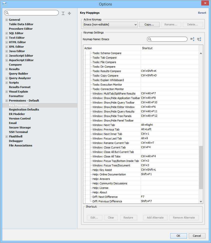Key Mapping Options Key Mappings - The Key Mapping Options allows you to configure new key mapping profiles with new key bindings. This allows you to configure any keystroke to any action. The Key Mapping Options allow creating custom keymaps by copying existing keymaps, then configuring individual shortcut key bindings within a custom keymap. All custom keymaps may be edited, renamed and deleted. It is possible to add alternate keybinding shortcuts within a custom keymap for the same action. There are two built-in keymaps which cannot be renamed, edited or deleted, but may be copied as the foundation for new custom keymaps: