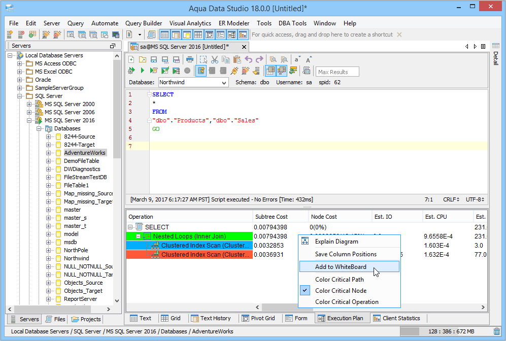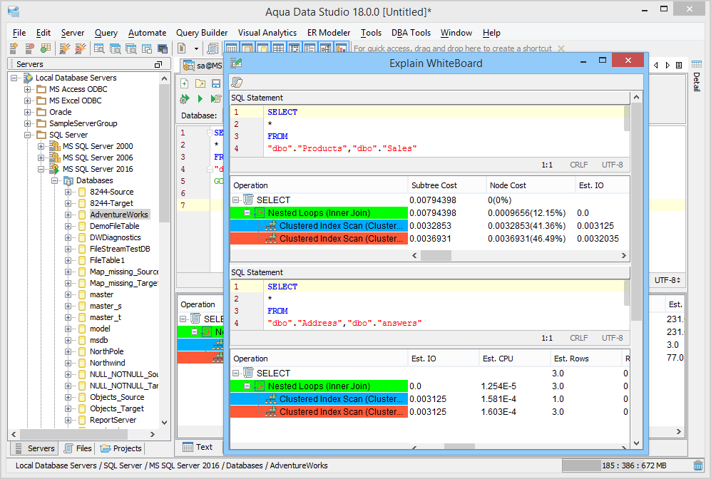 The Visual Explain Whiteboard acts as a workspace for conveniently comparing multiple Execution Plans. When Execution Plans are enabled as part of Query Results, the node cost, input output cost, CPU cost, cardinality and bytes for that query are displayed under the Execution Plan tab of the Query Analyzer window. Color coding of each operation in the executed query from the Query Analyzer helps with performance analysis. When multiple statements are separated by statement separaotrs such as "GO", each gets its execution plan pane. Right clicking on an execution plan allows that particular plan to be added to the Explain Plan Whiteboard. If the Explain Plan Whiteboard has been opened and closed, accessing Tools->Explain Whiteboard relaunches it with the contents last added to it. When performance tuning SQL statements, it is often useful to execute a plan on a statement, locate performance bottlenecks, modify the statement and then execute a second plan. Each additional Execution Plan added to the whiteboard is added at the bottom of the scrolling window in a resizeable pane, providing a convenient history of the executions for comparison. Columns within the Whiteboard are sortable. The Whiteboard can be cleared by clicking the "Clear Changes" button at the top left. |