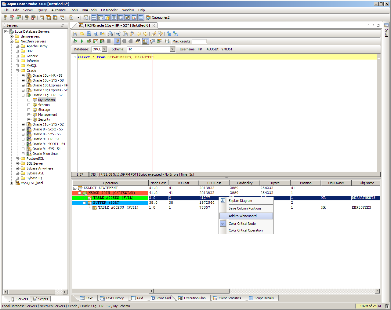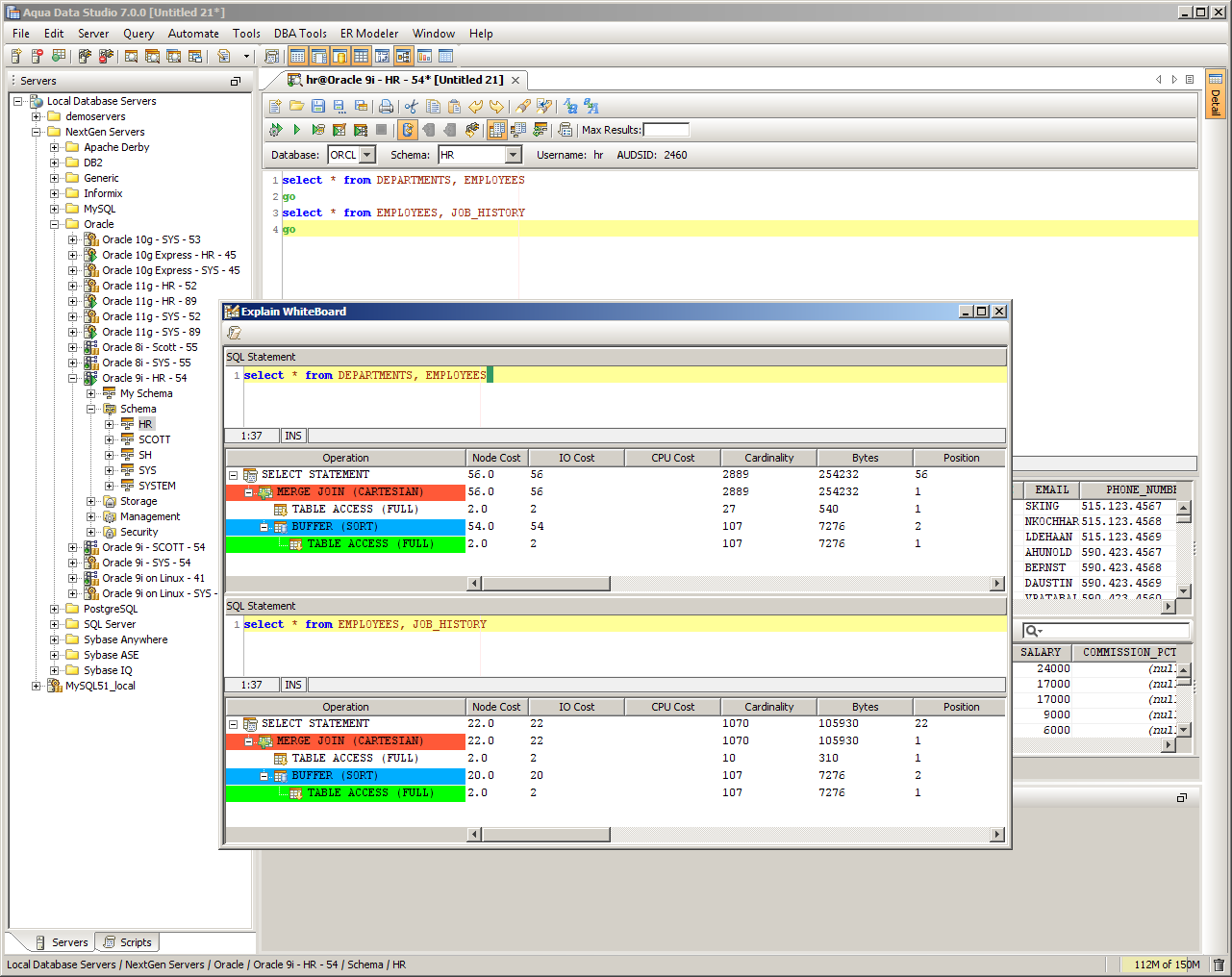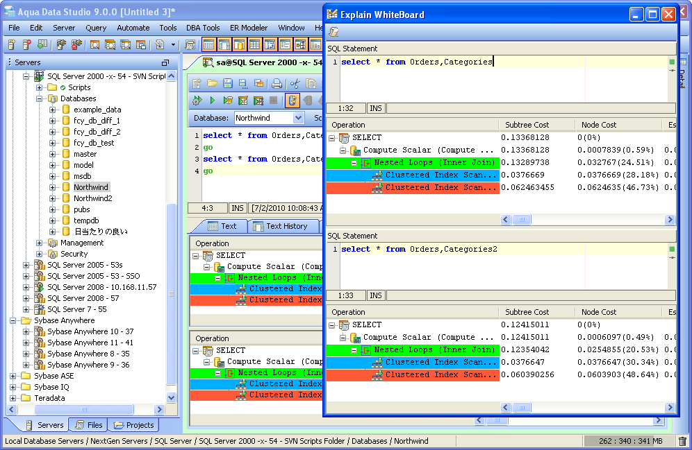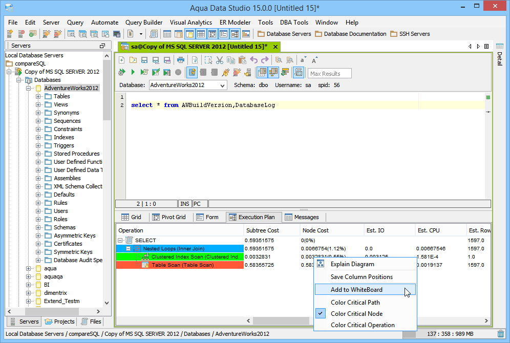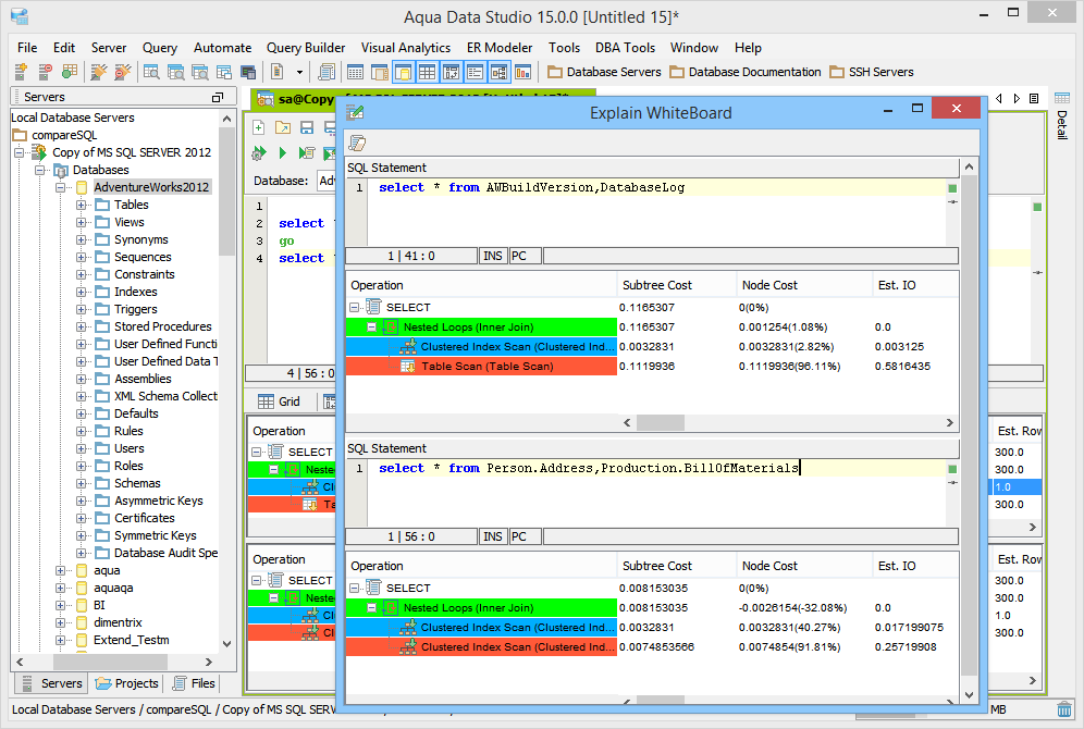 The Visual Explain Whiteboard acts as a workspace for conveniently comparing multiple Execution Plans. When Execution Plans are enabled as part of Query Results, the node cost, input output cost, CPU cost, cardinality and bytes for that query are displayed under the Execution Plan tab of the Query Analyzer window. Color coding of each operation in the executed query from the Query Analyzer helps with performance analysis. When multiple statements are separated by statement separaotrs such as "GO", each gets its execution plan pane. Right clicking on an execution plan allows that particular plan to be added to the Explain Plan Whiteboard. If the Explain Plan Whiteboard has been opened and closed, accessing Tools->Explain Whiteboard relaunches it with the contents last added to it. When performance tuning SQL statements, it is often useful to execute a plan on a statement, locate performance bottlenecks, modify the statement and then execute a second plan. Each additional Execution Plan added to the whiteboard is added at the bottom of the scrolling window in a resizeable pane, providing a convenient history of the executions for comparison. Columns within the Whiteboard are sortable. The Whiteboard can be cleared by clicking the "Clear Changes" button at the top left. |