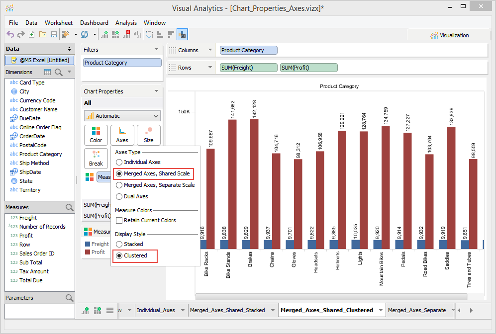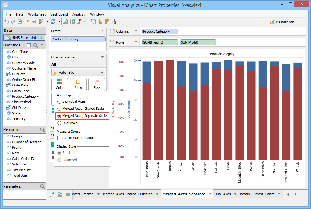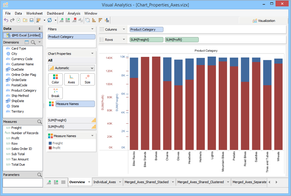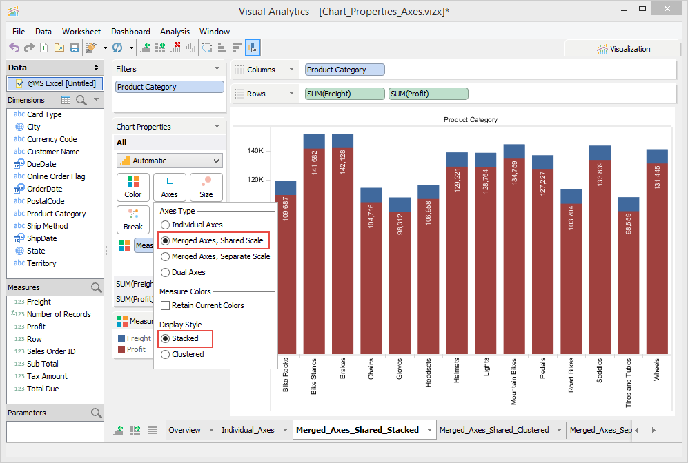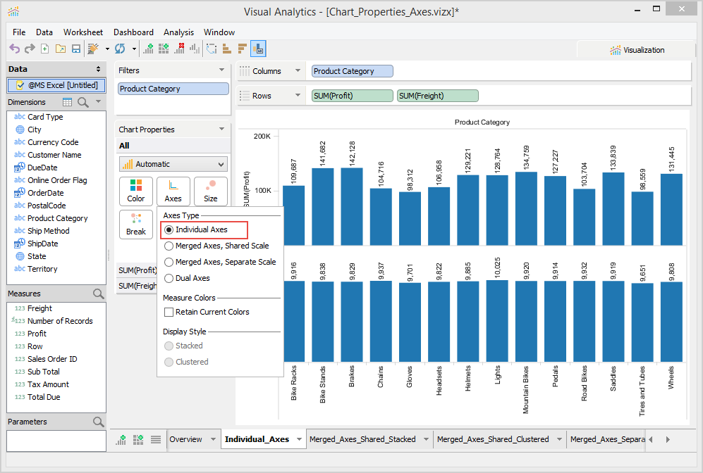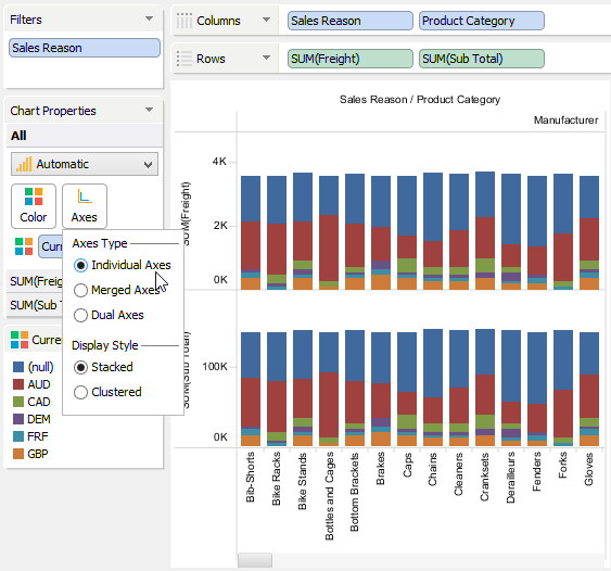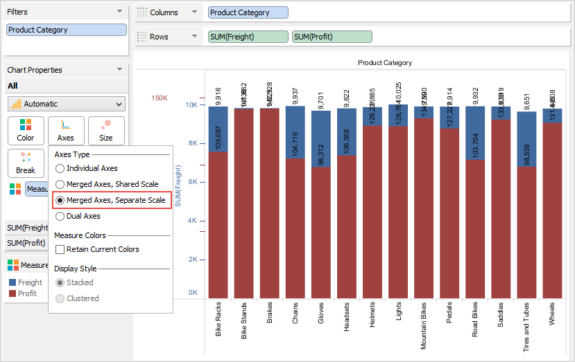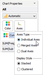 The Chart Properties deck allows you to modify and control the chart shown in the chart view. The contents of the Chart Properties deck changes depending on how many dimensions and measures appear in the Columns and Rows decks. If there are at least two measures present in a Columns or Rows deck, you can select options in the Chart Properties > Axes.