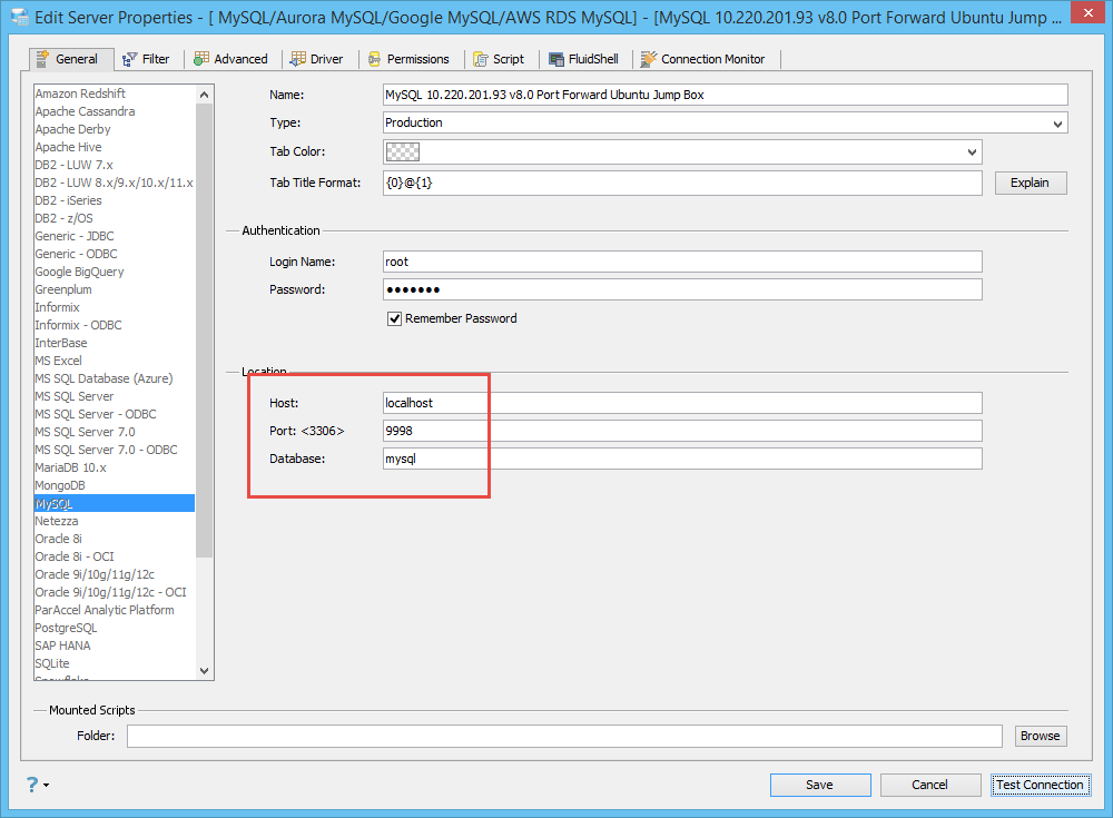 When we register the MySQL database server, we enter the connection information as localhost, port 9998. With this database connection setup and the port forwarding we have in the earlier example, the communication between ADS and MySQL will happen via the secure SSH tunnel. Note that in order for this to work, the SSH connection with port forwarding has to be opened and remain open for the duration of this database session.