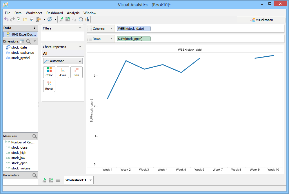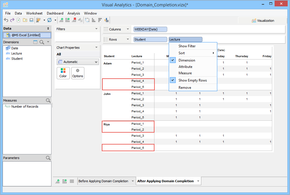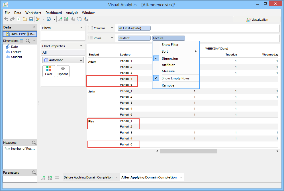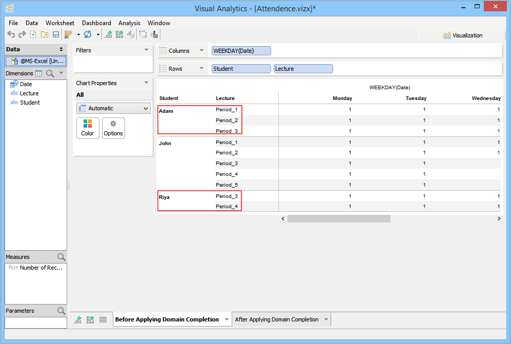 Domain Completion completes data by showing all available records for the specified dimension based on the unique values in your data set. Let’s consider a scenario where you want to compare the weekly attendance for each student of your class. Now, if a student does not attend a particular lecture for an entire week, the corresponding record might not be present in your data set. On applying domain completion on Period, Visual Analytics completes the record by displaying missing lectures for the students.