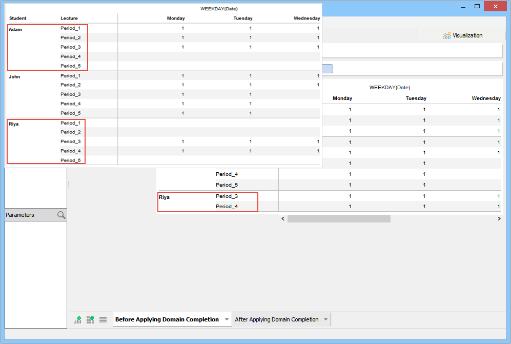 | Before applying Domain Completion, the missing lectures for John and Riya are not displayed | After applying Domain Completion; Visual Analytics displays the missing lectures for John and Riya |