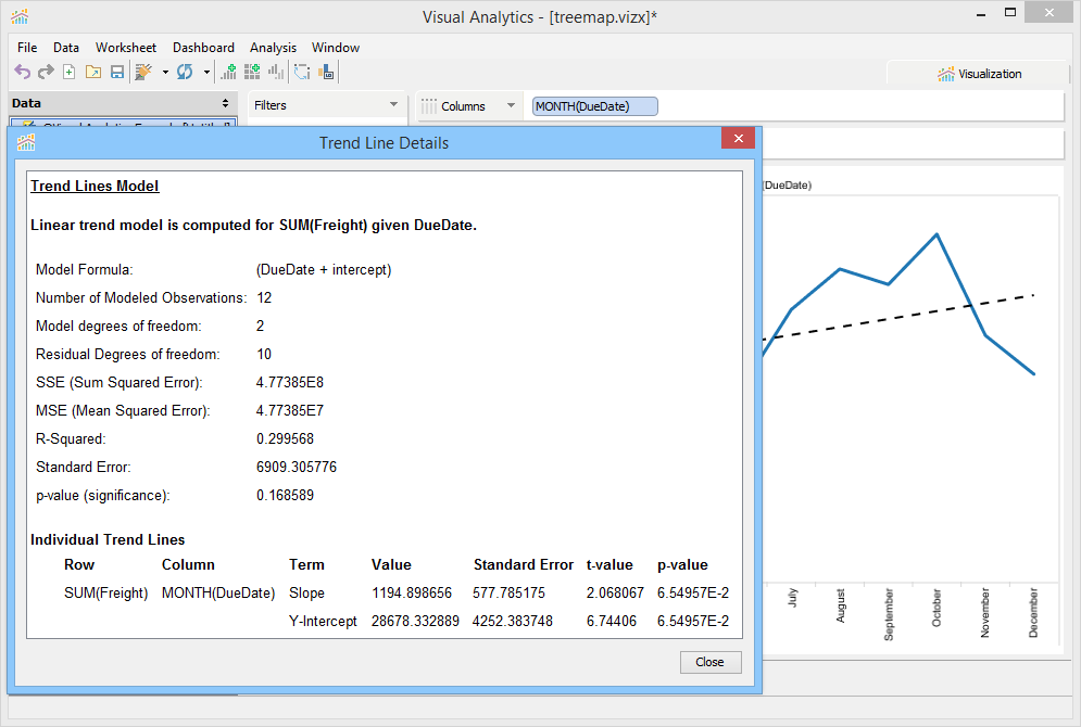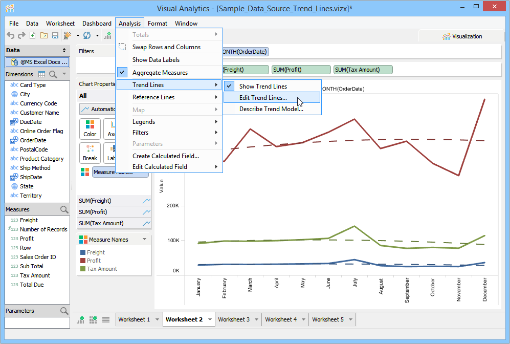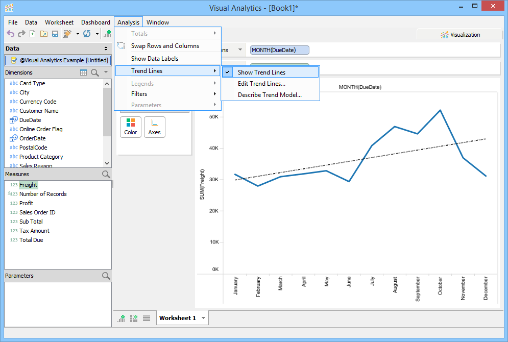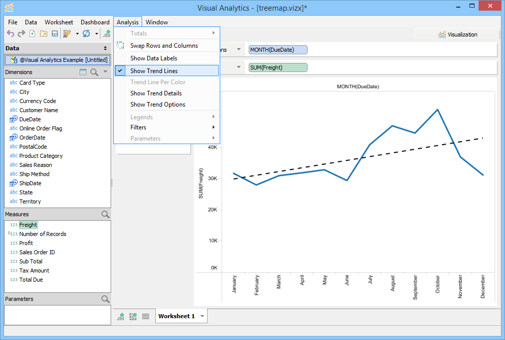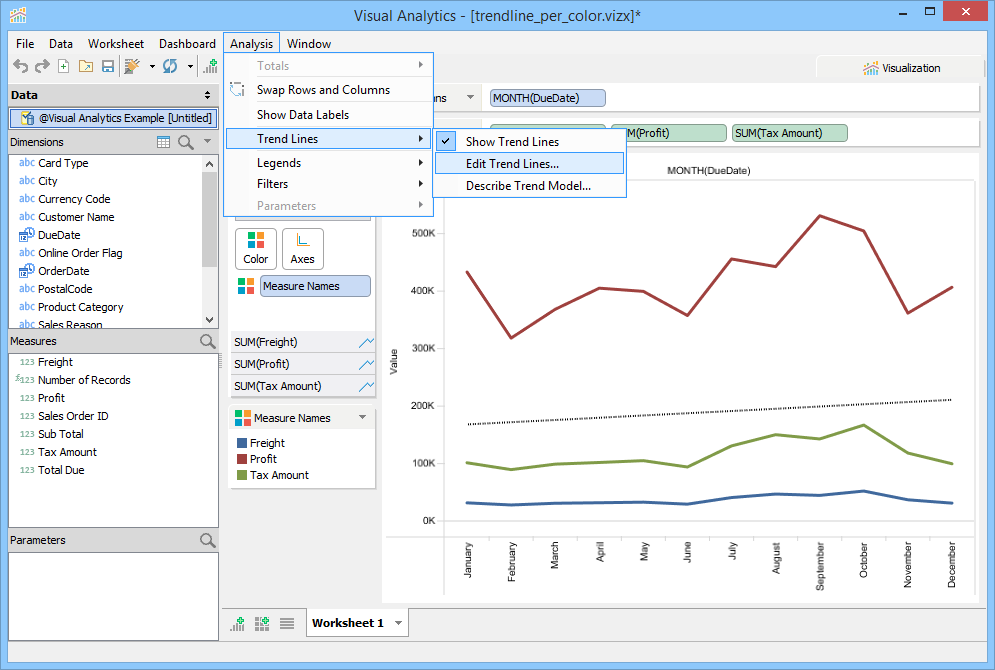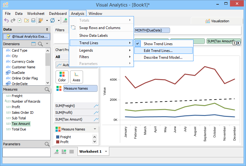 Trend Lines are lines that connect two or more points and then extend into the future to assist in detecting and predicting trends in time-series data. To display Trend Lines select [Analysis > Show Trend Lines]. Trend Lines display as black lines overlaid on the current view and are dashed when shown over Line Charts and solid when shown over bar charts to prevent confusing them with original chart content. You can also edit Trend Line Options with [Analysis > Trend Lines > Edit Trend Lines...] when [Analysis > Trend Lines > Show Trend Lines] is enabled.