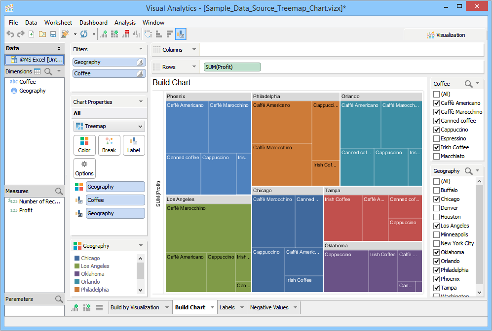 Visualization moves Coffee and Geography to the Labels Deck and Freight to Color Deck. If you click the Label Deck, Show Data Labels are selected by default. Now, in the Color Deck, replace Freight with Geography and apply a filter to both Coffee and Geography dimensions.
