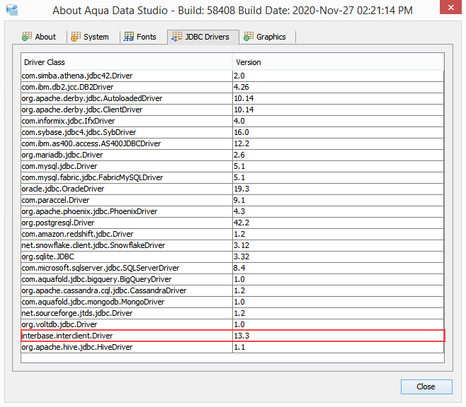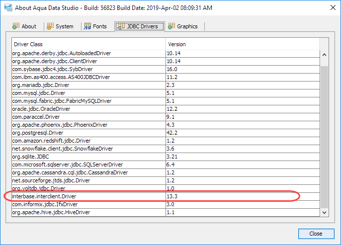 To update the Aqua Data Studio JDBC driver for InterBase you need to overwrite the Aqua Data Studio interclient.jar file. Below is a listing of the Aqua Data Studio library directory [ADS_INSTALL]\lib\drivers\ ...