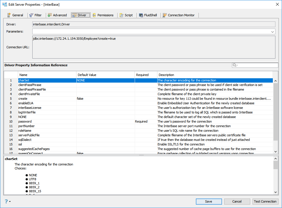 With options in Driver properties of a Server, you can edit/view the: