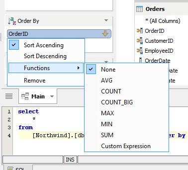 3. Or right click to select a Function [AVG, COUNT, COUNT_BIG, MAX, MIN, SUM]