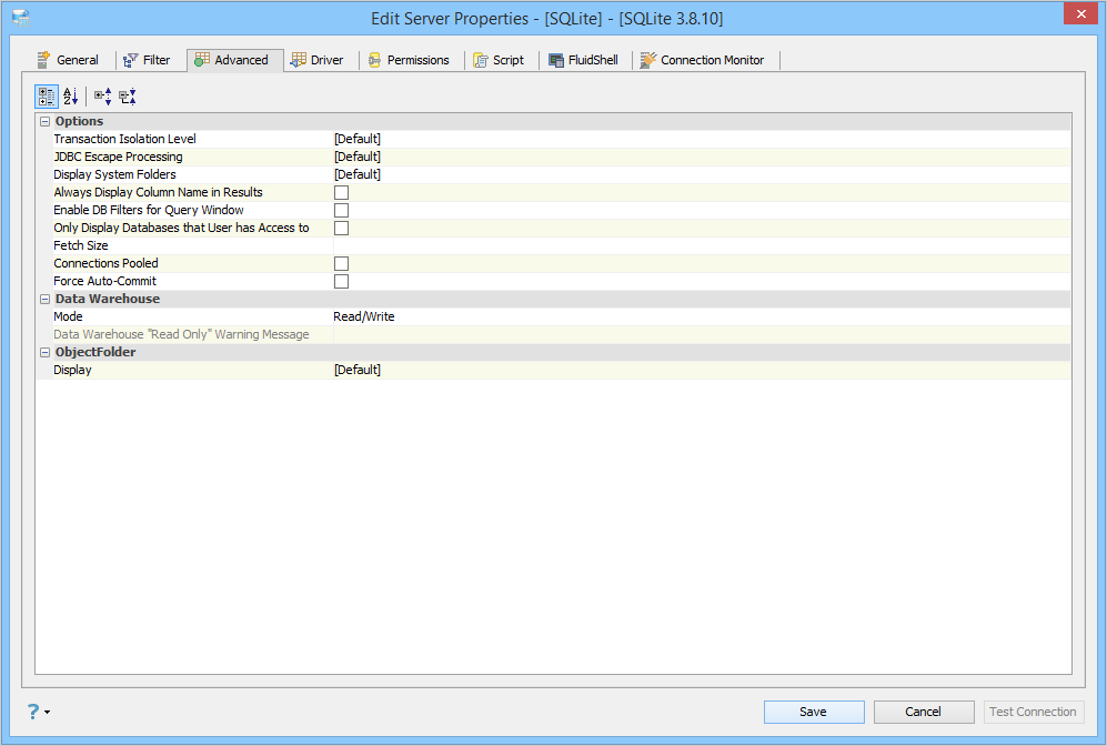 Edit the Server Properties to use Advanced Properties in Aqua Data Studio: