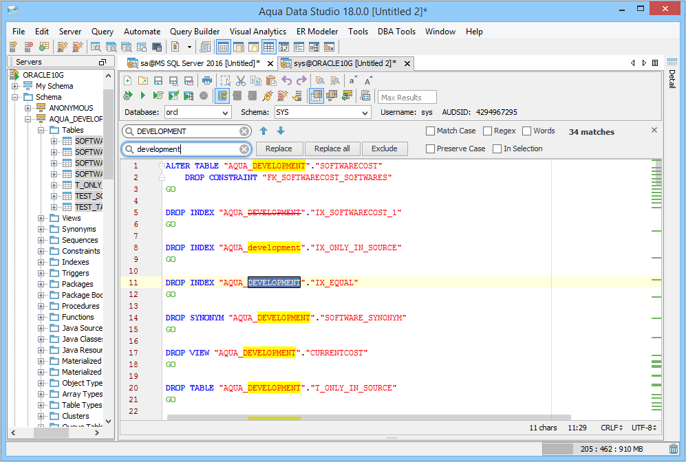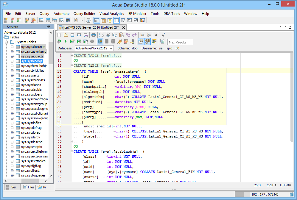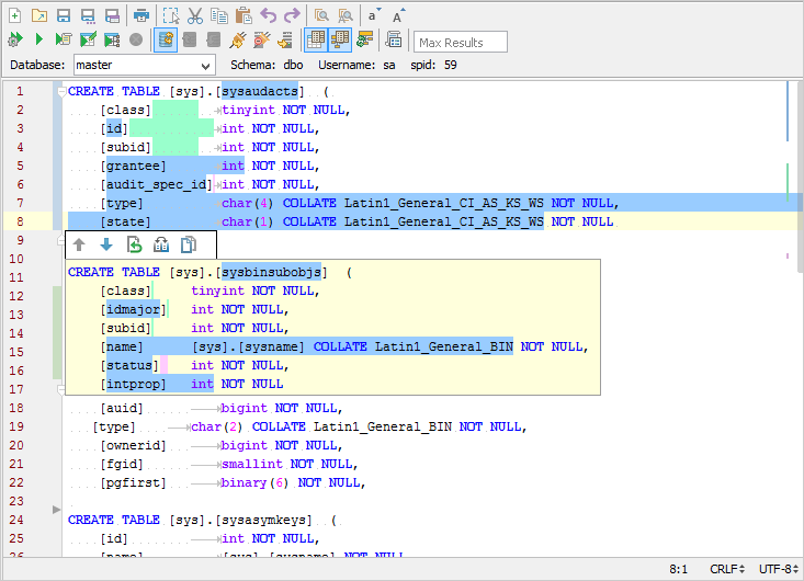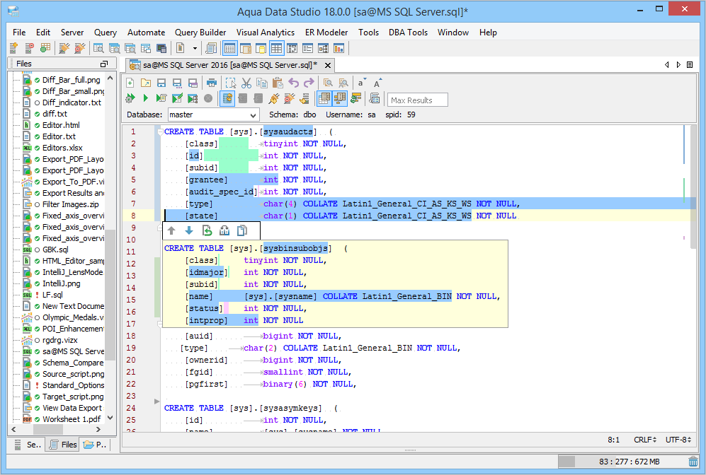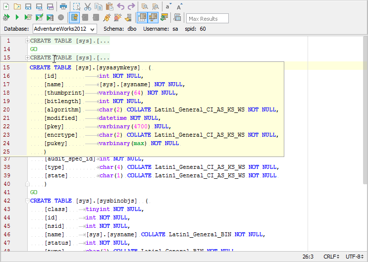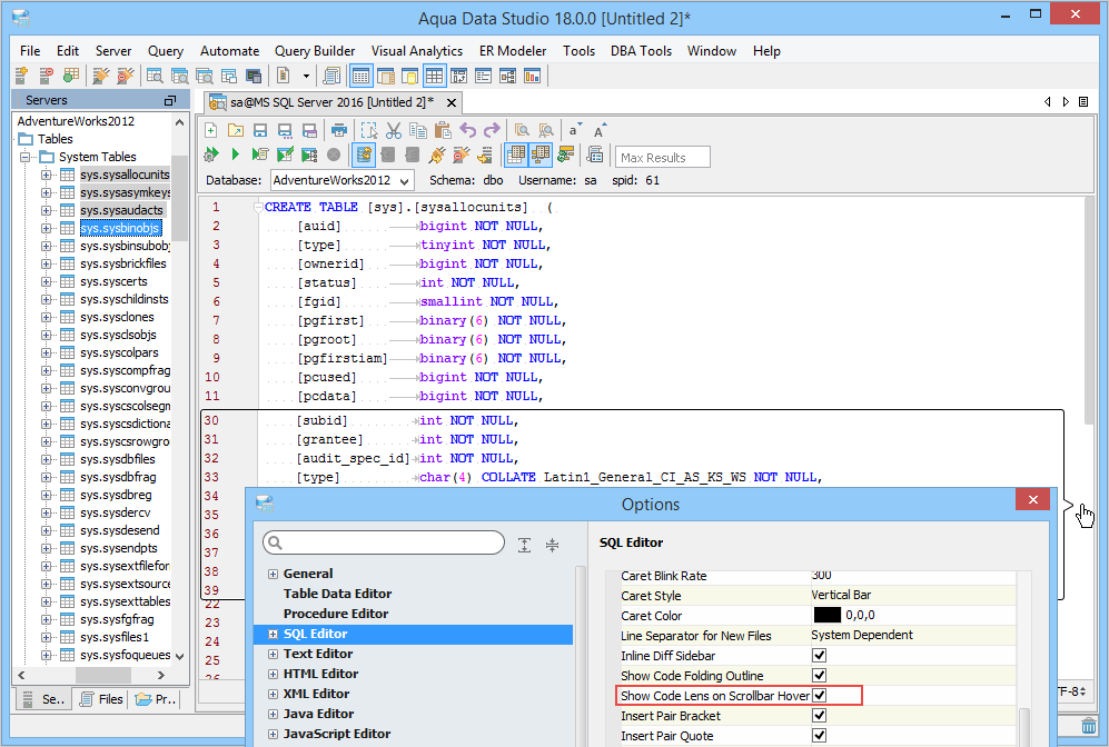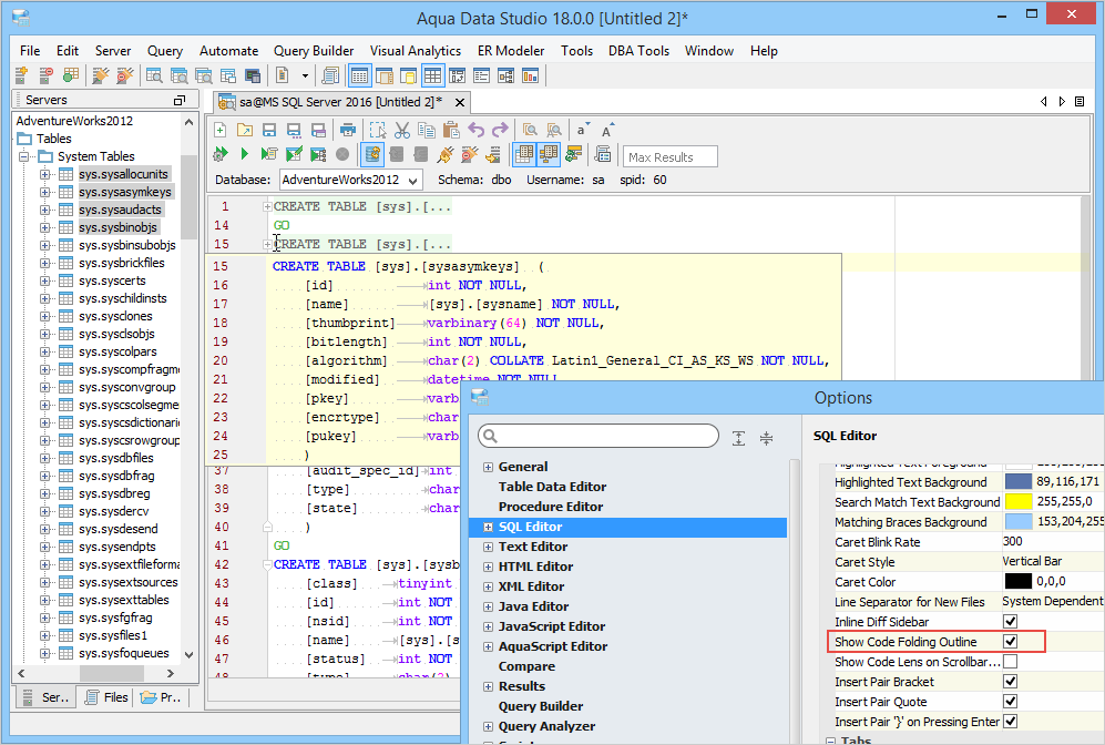 By default, the maximum content size for code insight features is 1000 K. If that limit is exceeded, all the code insight features, such as automatic code folding and tag completion are disabled. The maximum content size for code completion is 20000 K. If that limit is exceeded, features, such as code-completion, punctuation completion, indent guides and brace highlighting are disabled. In both cases, Aqua Data Studio displays the currently configured size and the actual content size.