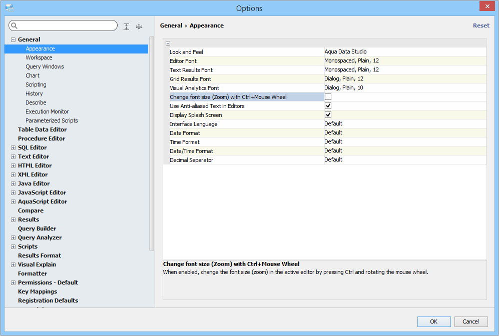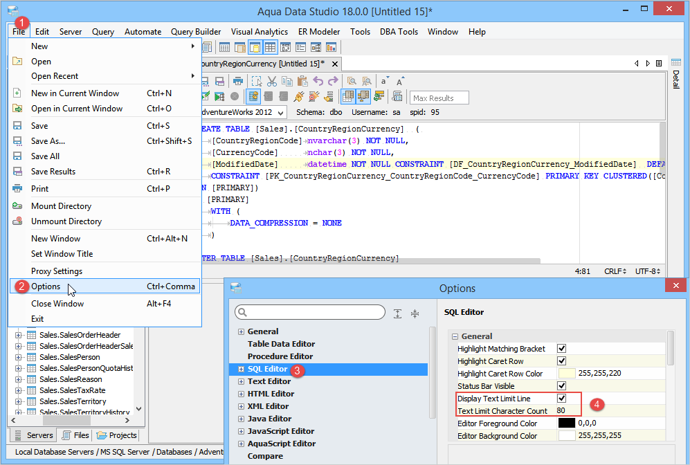 By default, a light gray vertical line appears at column 80 in the editor, indicating where a line exceeds 80 characters. You can set this text limit indicator to another value from the Options dialog. If you change the font, Aqua Data Studio plots the line based on the word space of the set font.