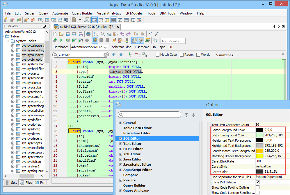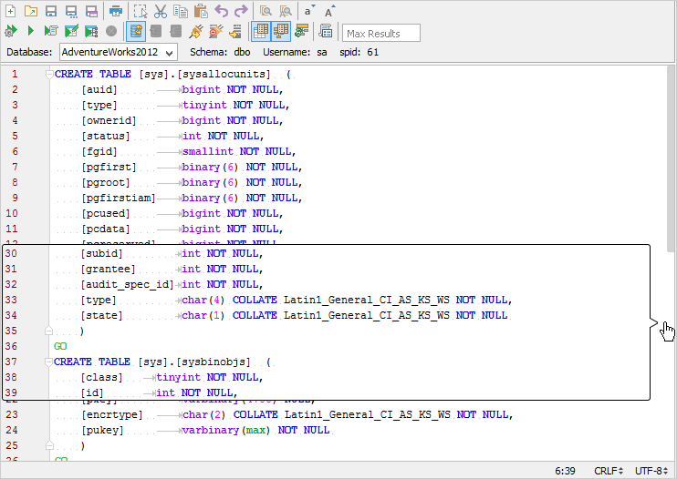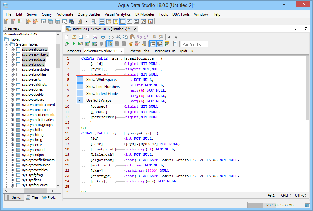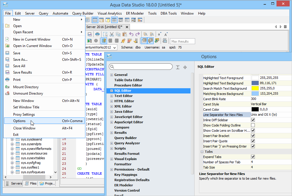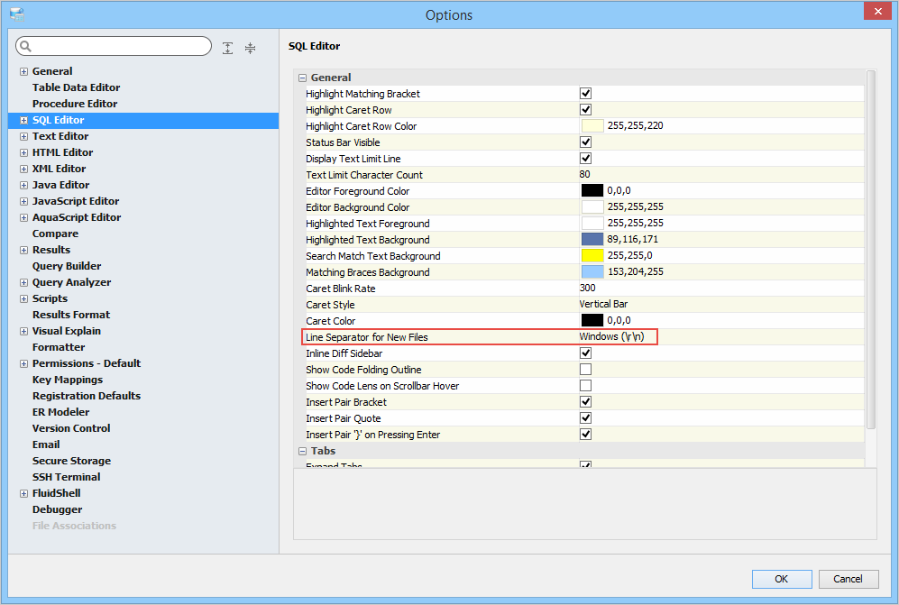 By default, Aqua Data Studio applies indentation of the current line to the next line when you press Enter. On unselecting this setting, no indentation is performed and the cursor is positioned in column 1 of the next line.
