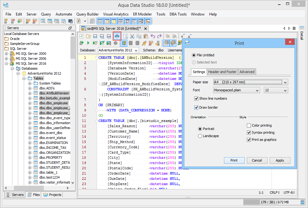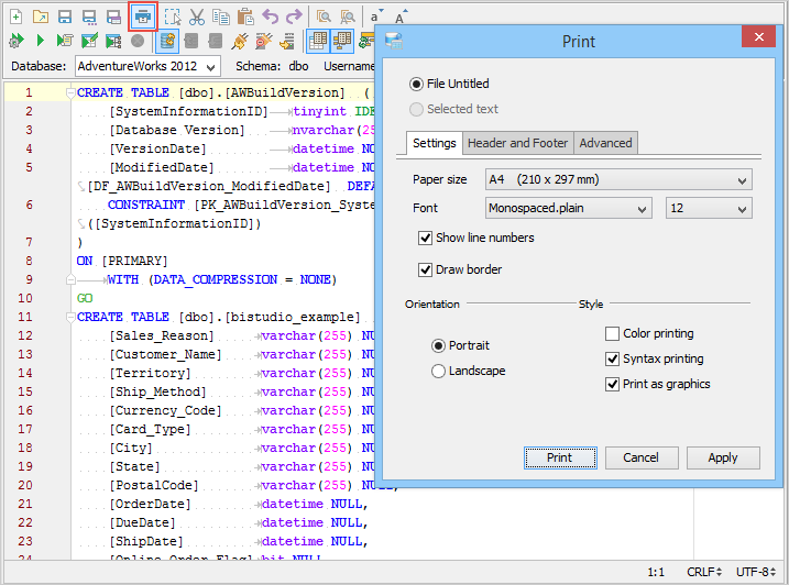 The Print dialog can be launched from the toolbar () or by using the shortcut keys (CTRL/Command+P). For executed queries, you are prompted to choose the tab for printing. If no query has been executed, then the Print dialog is launched directly.