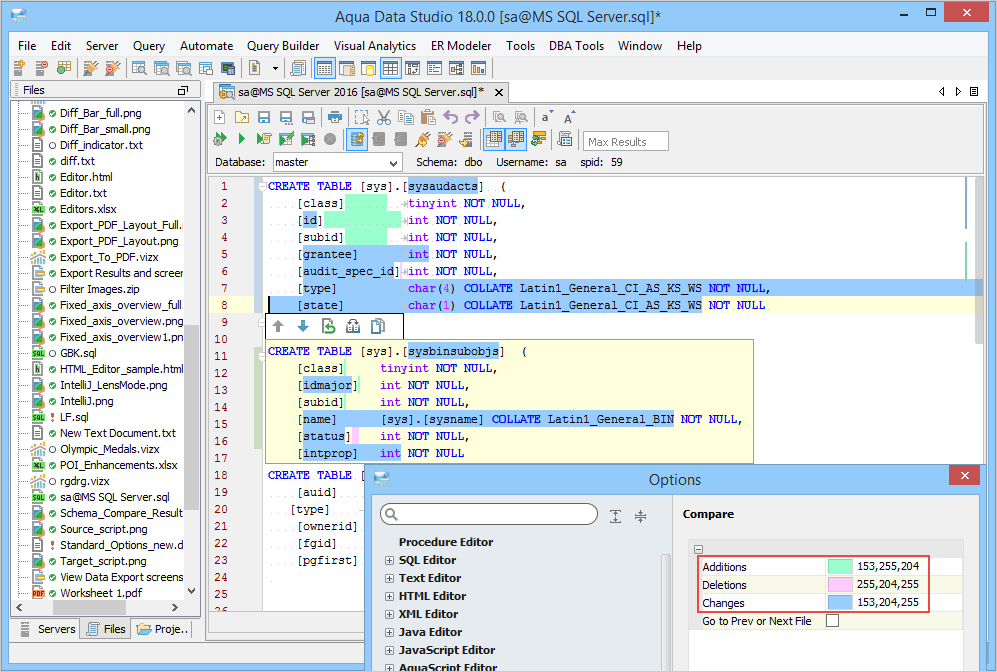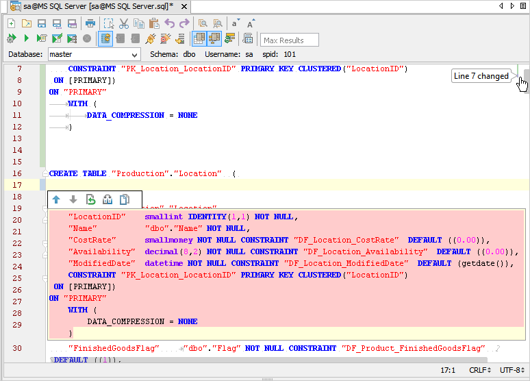 When you modify a file in a version controlled repository, Aqua Data Studio displays inline diff indicators on the Annotation bar. The inline diff indicator automatically indicates the differences between the edited file and its corresponding file in the repository using a different color for each action; a green diff indicator () signifies addition and a blue diff bar indicator (