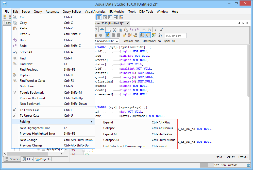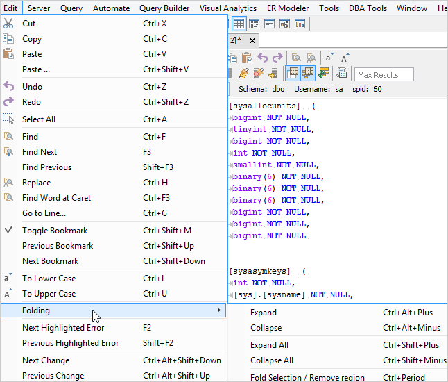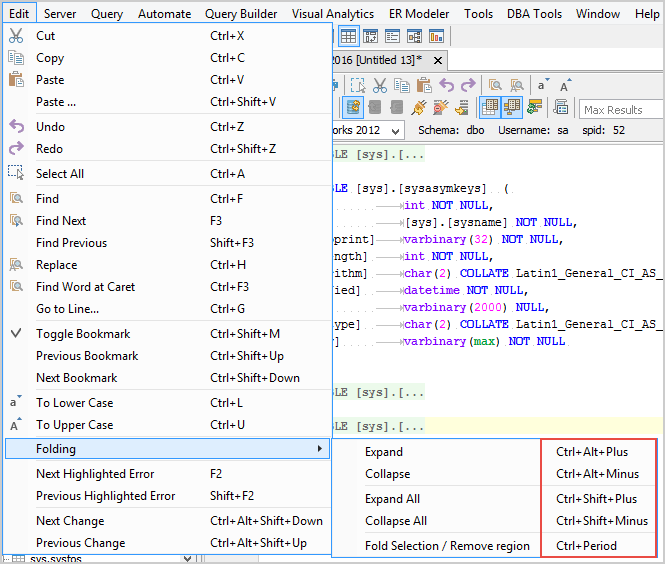 | Fold Selection / Remove region | Folds the entire selected code, even if the code folding setting is disabled. |