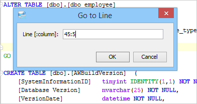 Go to Line navigates you to a specific line in the editor based on the user-entered number. You can view the current line and column number in the Status Bar. A colon separates the line and column number. To navigate to a specific line, click CTRL/Command+G and open the Go To Line dialog. Type the new line and column number separated by a colon, and then click OK.