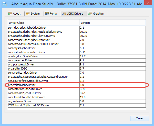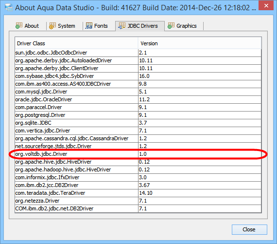 To update the Aqua Data Studio JDBC drivers for VoltDB you need to overwrite the Aqua Data Studio voltdb.jar file. Below is a listing of the Aqua Data Studio library directory [ADS_INSTALL]\lib\drivers\ ...