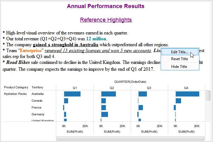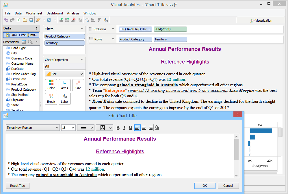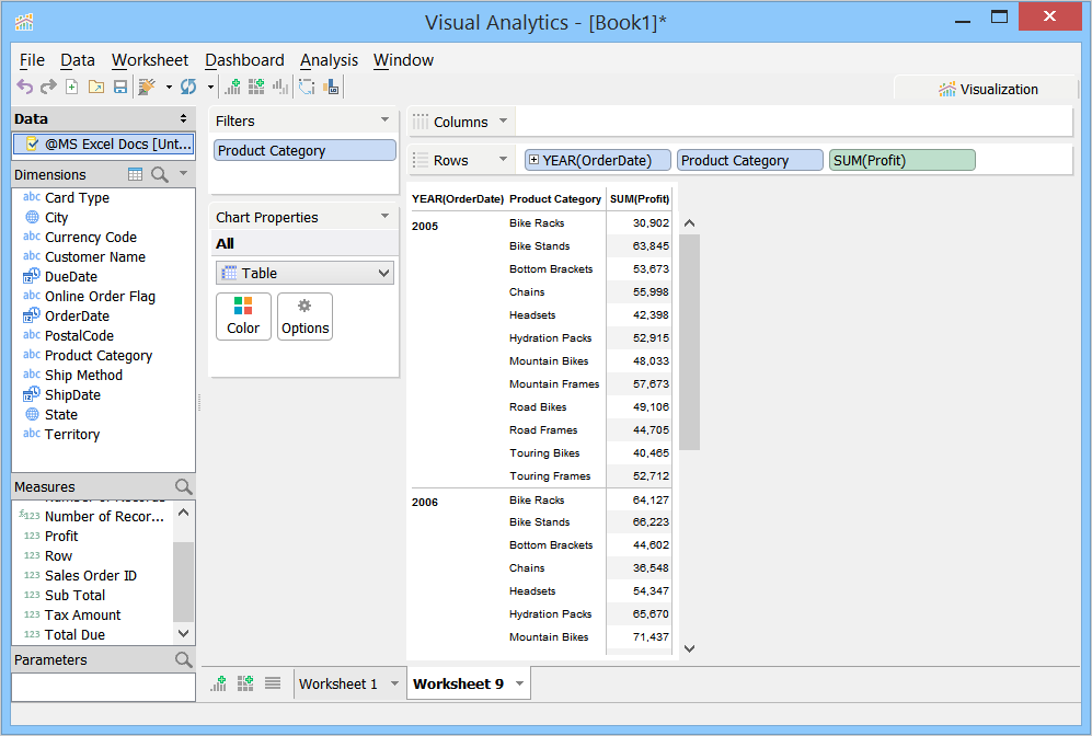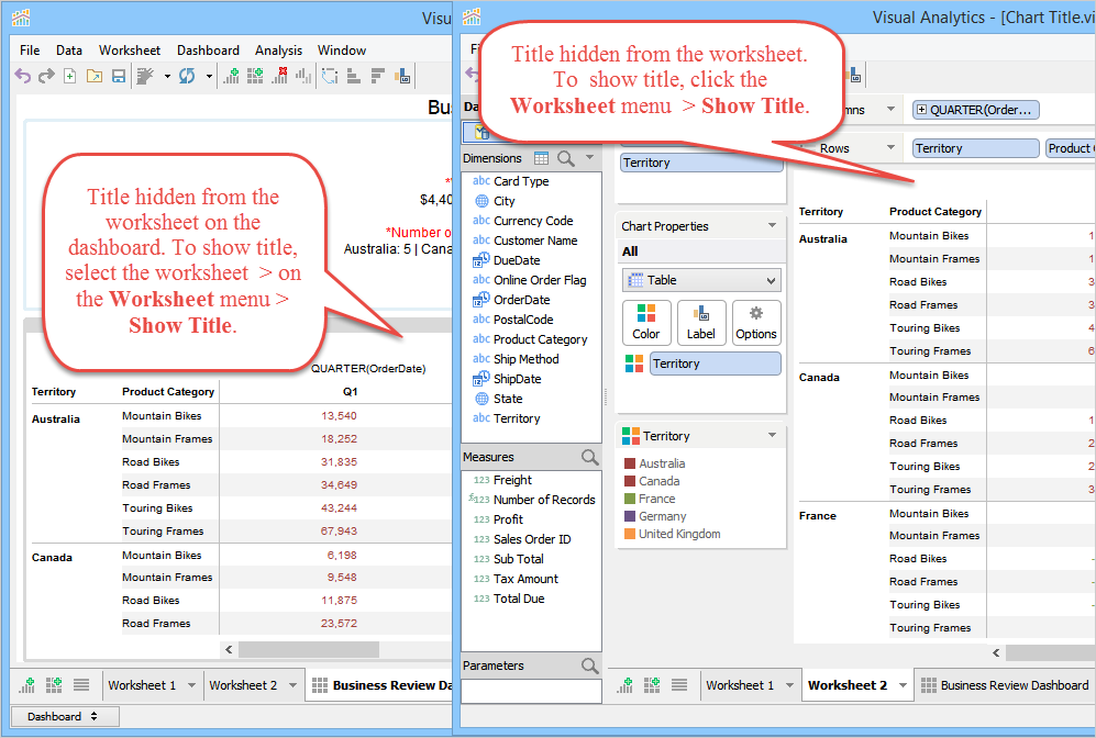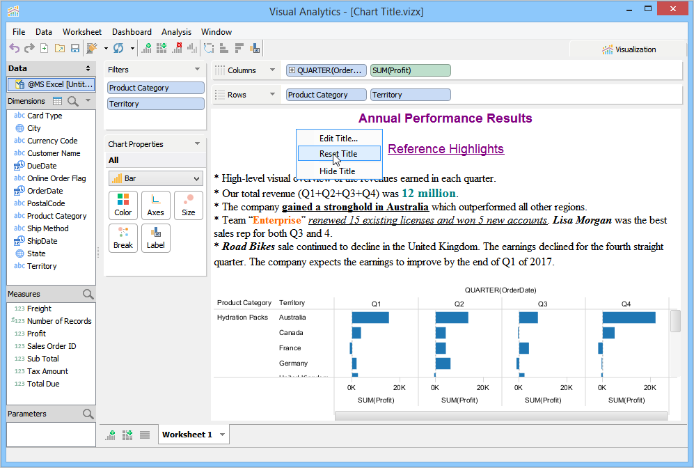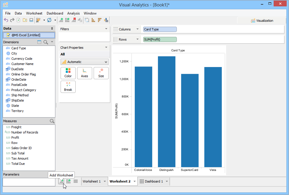 When you launch Visual Analytics for the first time, it automatically generates a sheet labeled "Worksheet 1” and displays the sheet name as the chart title in the chart view. This sheet name can be edited, formatted, and shown or hidden from the chart view. For more information, see Chart Title. If you want to create additional sheets, perform one of the following steps.