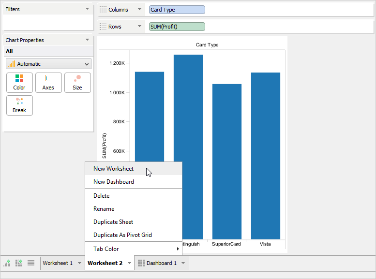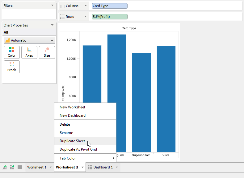 To duplicate an existing Worksheet or Dashboard, left click its tab and select [Duplicate Worksheet]. This is useful for making a copy of your work so you can make modifications on existing views without altering the original content.