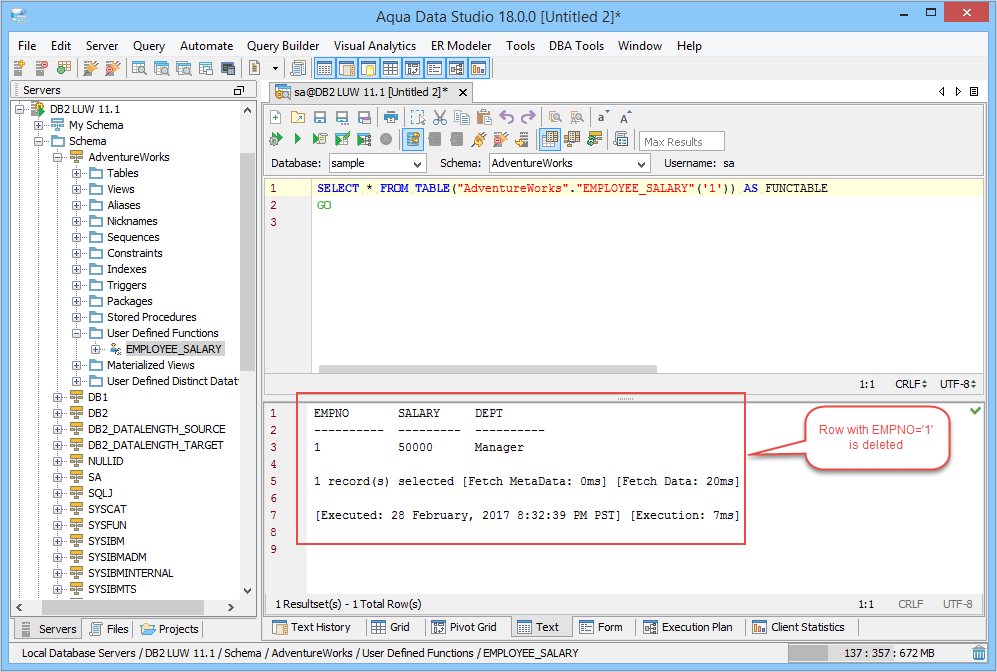 SAMPLE DB2 USER DEFINED FUNCTION This User Defined Function when executed will delete row from the table DB2ADMIN.AQUA_CUSTOMER based on the input parameter Aqua_Code. This parameter is matched to the specified TITLE column in the table. For example, if you want the UDF to delete rows from the table with TITLE=Manager, you need to specify the input parameter AQUA_CODE as 'Manager'.