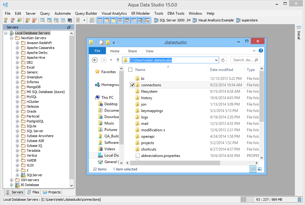 Aqua Data Studio's settings, options, connection files and configurations are designed to be easily backed up, copied and modified. It is possible to transfer all or some of the files which are used for database server and SSH server registrations to another user or another computer. The locations of these files vary based on the Operating System.