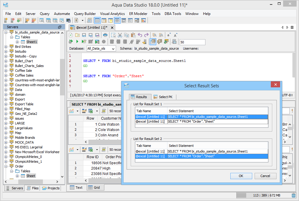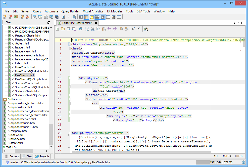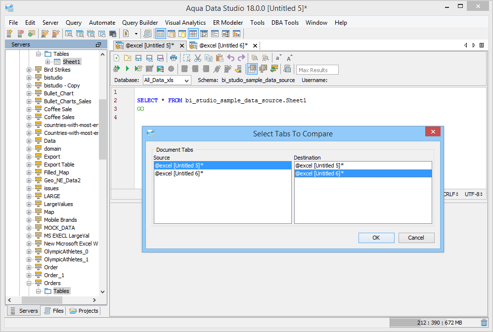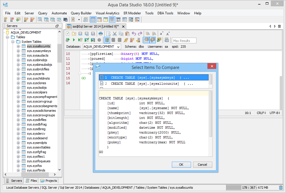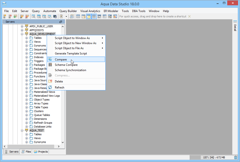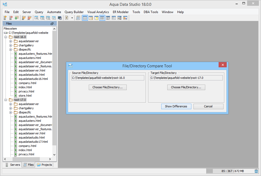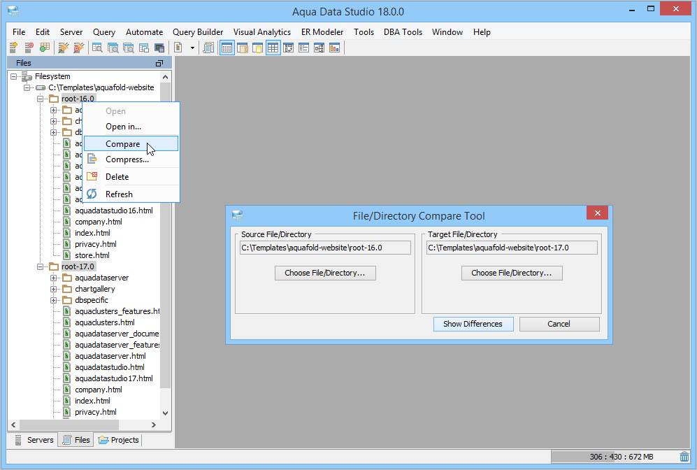 Aqua Data Studio provides six compare tools to easily compare database schemas, schema objects, queries, query results, files, directories, clipboard contents and version control history.