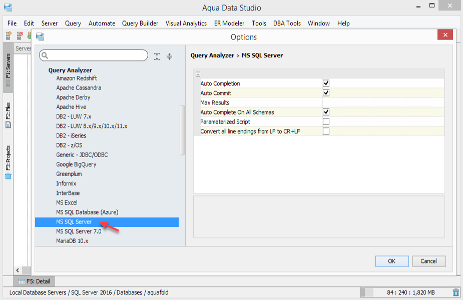 Within the Query Analyzer, there is a drop-down menu for picking other databases on the currently connected server. Multiple Query Analyzers can be open at the same time in different tabs or within additional free-floating Query Analyzer windows. Editing Properties of a Query Analyzer in Aqua Data Studio The properties of the Query Analyzer can be viewed and altered by selecting File > Options > Query Analyzer from the main menu. There are defaults set for the Query Analyzer in the Options Dialog, depending on the database vendor and version chosen. The preset defaults for each vendor and version have been selected based on previous user experience and supporting database documentation.