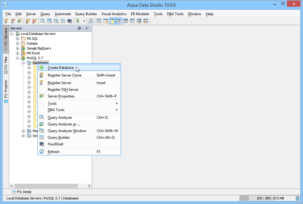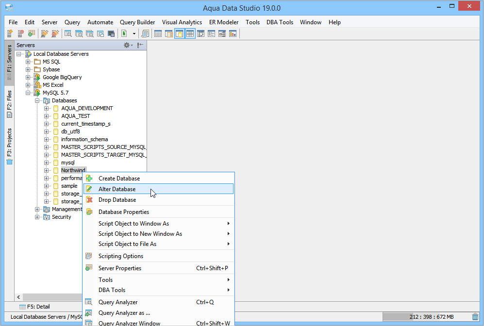 Within the Schema Browser, connections that support database creation will have a databases container underneath the connection icon when the server connection tree is expanded. Once a server connection has been established, creating a database can be done by right clicking on the connection in the Schema Browser and selecting, "Create Database". Aqua Data Studio strictly follows the functionality and API (application programming interface) provided by each database vendor, and therefore cannot provide a direct graphical method for database creation in Apache, DB2, Oracle and Teradata. The database server connections which do not directly support "database" as a schema object - Apache Derby, DB2, Oracle, Teradata, VoltDB - may have Database Administration Tools for managing Tablespaces and Storage and Instances. See the DBA Tools section for more on the tools available in Aqua Data Studio. Server connections to these vendors do not include a database container within their expanded trees in the Schema Browser. They will have My Schema and Schema containers which then contain tables other objects. The screenshot displays a MySQL Server that allows the creation of a database in the Schema Browser Tree. Below it, an Oracle 12c server connection has been expanded to reveal it does not have a databases container. There are containers for My Schema and Schema. ALTER Database Existing Databases can also be ALTERed through the Visual Editing tools. Right clicking on a database allows selection of "Alter Database" DROP Database The Visual Editing tools also allow users to DROP an existing database through right click in the Schema Browser. |