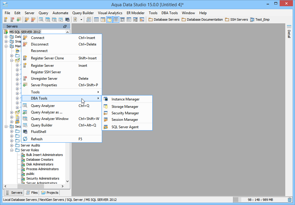 MS SQL DBA Tools The MS SQL Database Administration (DBA) Tools provide users with the tools to administer, manage and monitor all aspects of a MS SQL database. The tools may be accessed from the application DBA Tools menu or from the schema browsers context sensitive popup menu. The following is a list of tools provided with a description of each tools functionality.
