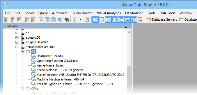The purpose of the SSH Browser is to help you visualize and maintain your SSH Servers. The SSH Browser makes use of procfs (or the proc filesystem), a special filesystem in UNIX-like operating systems that presents information about processes and other system information in a hierarchical file-like structure, providing a more convenient and standardized method for dynamically accessing process data held in the kernel than traditional tracing methods or direct access to kernel memory. Typically, it is mapped to a mount point named /proc at boot time. You can quickly view server version information, including: OS, CPUs, Memory, Disks, File Systems, Network Interfaces and the different Users. Currently this feature is not supported in MAC OSX, but would be added in a future release. After registering SSH Servers in the Servers Browser, details about those servers can be displayed by double clicking them or right clicking and choosing "Connect". A tree expands giving details on OS, CPUs, Memory, Disks, File Systems, Network Interfaces and Users. Each of these can be expanded as a tree to display more details.