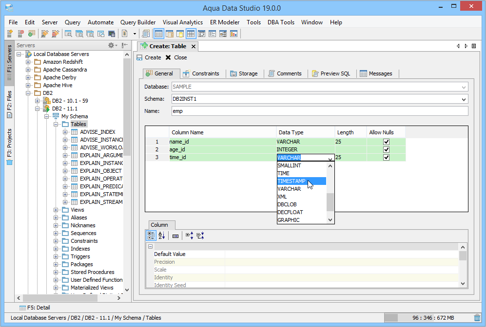 Aqua Data Studio contains GUI tools for visually editing and creating Tables. CREATE Creating tables through the GUI Tools available in the schema browser begins with opening a database server connection and expanding the tree to view the server's tables. Right clicking on the schema container for Tables generates the pop-up menu containing "Create Table" as its first item. The Create Table dialog has General, Constraints, Storage and Preview SQL tabs across the top. The General tab is where the table is named and its columns and datatypes are set. The Column information displays more details about the selected columns in the descriptin area below the column grid. INSERT and DELETE of columns is available via right click on the Column Names within the General tab of CREATE and ALTER dialogs. All of the datatypes available to the current database can be accessed with a dropdown next to the column names. When creating User Defined Table Types in Microsoft Azure SQL, the Create Table dialog shows only the General tab, the Constraints tab and the Preview SQL tab. The Constraints tab allows selection of columns for use in constraint creation (including Primary Key) and check conditions. Constraint properties details such as Name, Type, Ref Schema, Ref Table and Check Condition are modifiable visually. Constraint Definition Table Columns and Referenced Columns can be visually edited. For more on constraints, see the Creating Constraints page. The Storage tab provides details on Tablespace and table storage, its content vary depending on server vendor and version. The Comments tab provides space for text comments that will be stored with the table in the database. Some vendors also allow Table Column Comments, to make comments on specific columns. Where this is available, such comments will also appear ER Models containing tables with these properties. The Preview SQL tab displays the DDL used to generate the table and its properties based on the settings of the other tabs. Below are the steps used to create a table in DB2 10.1. Because other databases may not have dimensions, steps 6 and 7 may not be needed.
