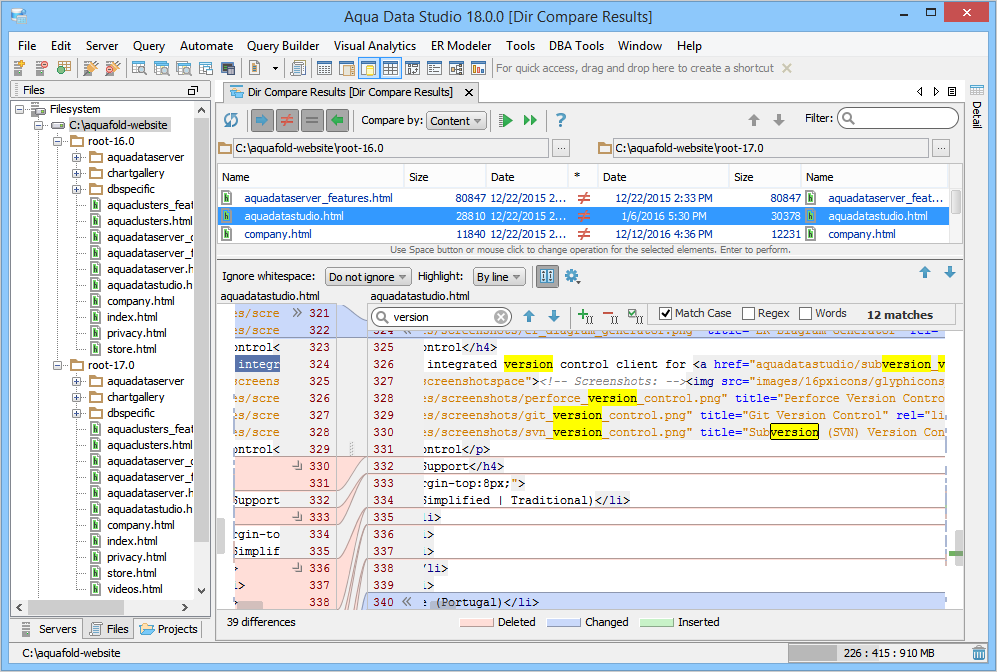 . The contents of the selected file are shown in the lower pane, also known as the Differences pane with the differences highlighted. This pane is further split into a split-pane where each file takes up half of the pane and shows connecting splines for identifying where the deletions, changes and additions occur. Comparisons show the character differences in a modified line with bolding and background color highlights indicate modified blocks. If they are not identical they are highlighted by default in pink (deleted), purple (changed) or green (added). These colors can be changed from the Options dialog. You can also use this tool to synchronize the contents of the directories