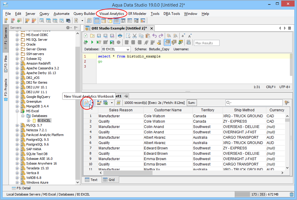 The first step to launching Visual Analytics is to execute a query in the Query Analyzer in Aqua Data Studio. Once results are generated from your query, you can launch Visual Analytics by: