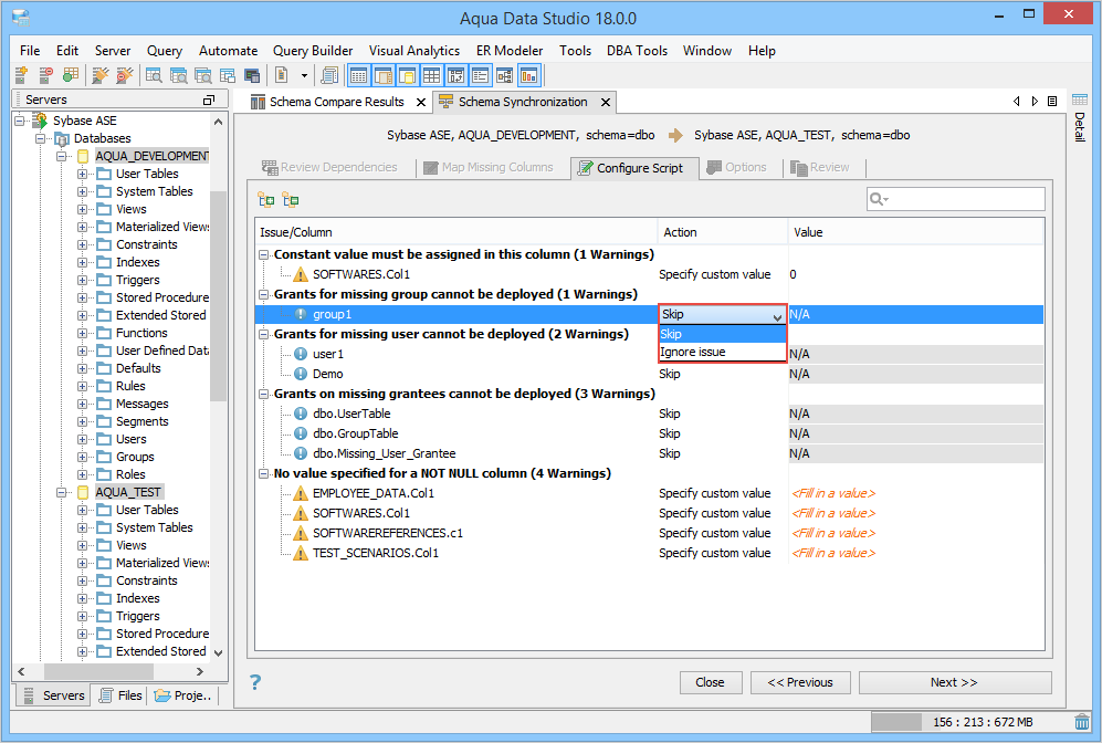 If you execute the deployment script without creating the missing user in the target database, the deployment script will fail.