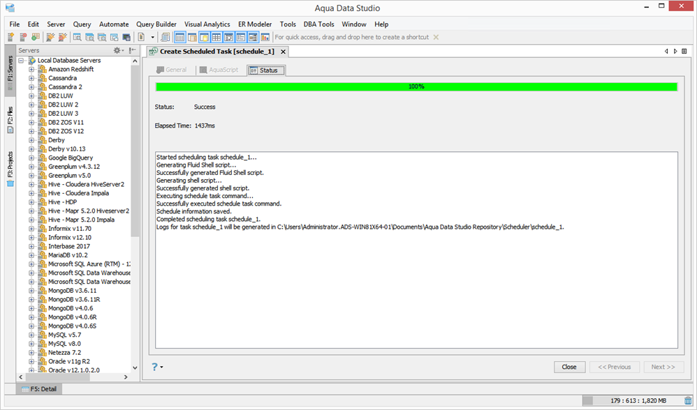 4. When you've reviewed your AquaScript project, click Next to check the Status tab where it will show the progress and detailed information of your AquaScript scheduled task executed.