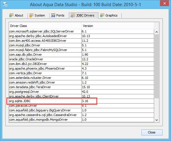 To update the Aqua Data Studio JDBC drivers for SQLite you need to overwrite the Aqua Data Studio sqlite-jdbc.jar file. Below is a listing of the Aqua Data Studio library directory [ADS_INSTALL]\lib\drivers\ ...