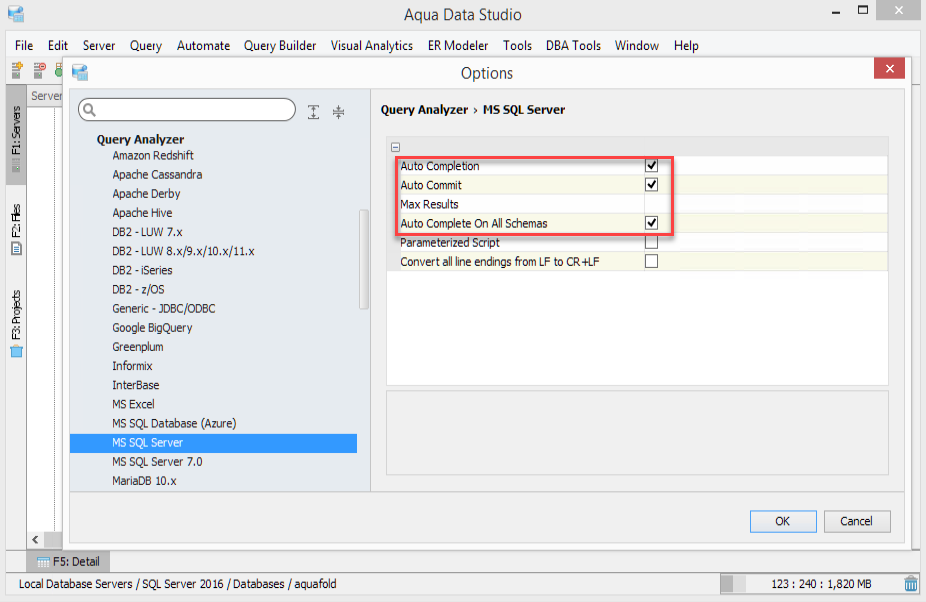 Within the Query Analyzer, there is a drop-down menu for picking other databases on the currently connected server. Multiple Query Analyzers can be open at the same time in different tabs or within additional free-floating Query Analyzer windows. Editing Properties of a Query Analyzer in Aqua Data Studio The properties of the Query Analyzer can be viewed and altered by selecting File > Options > Query Analyzer from the main menu. There are defaults set for the Query Analyzer in the Options Dialog, depending on the database vendor and version chosen. The preset defaults for each vendor and version have been selected based on previous user experience and supporting database documentation.