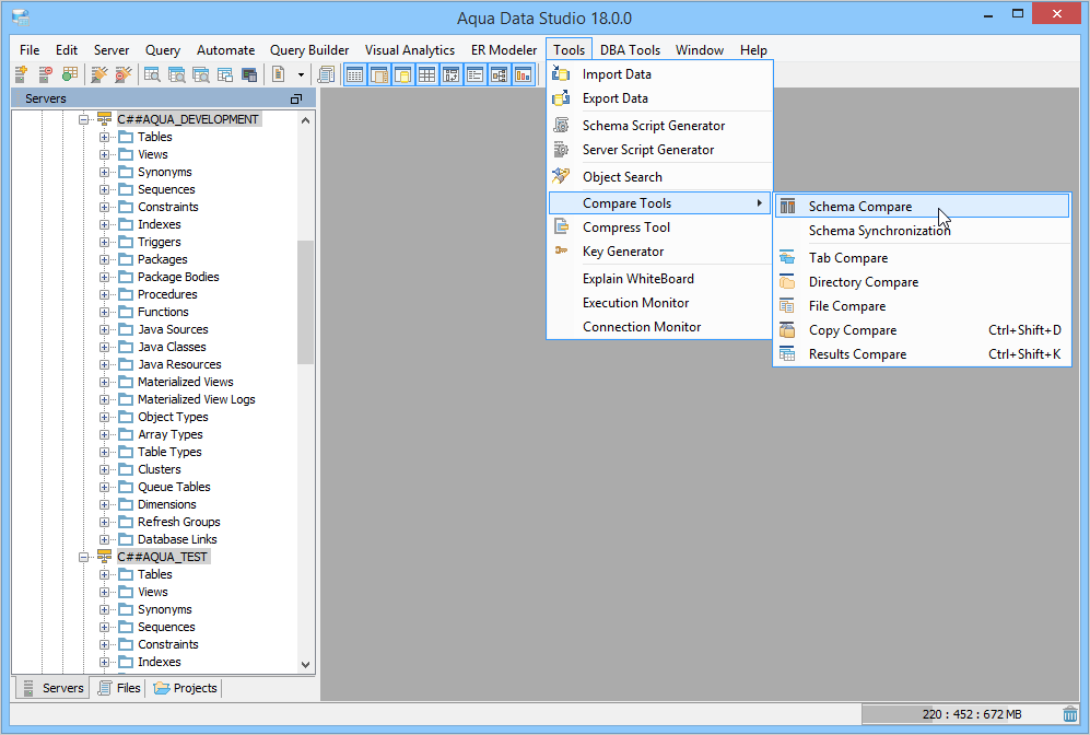 There are two different types of Compare for Database Schemas; Schema Compare for schema objects and Compare for schema DDL. Schema Compare (schema objects) can be done with a multi select of two databases in the Schema Browser, or with the menu Tools->Compare Tools->Schema Compare. With the Schema Compare Tool it is possible to compare individual objects, including databases, tables, triggers, indexes and more within different databases. A full discussion of the Schema Compare Tool is found on the Schema Compare Tool page. Once a Schema Comparison has been performed, it is also possible to compare database data. See the Compare Schema Data section of the Schema Compare page for more. Compare (DDL compare) of two database schema objects can be done with a right click on the two schema objects in the Schema Browser and selecting Compare from the popup menu. Aqua Data Studio generates the DDL comparison as a Query Results Comparison, placing the DDL of each selected schema object side by side with splines and adjacent line numbering. Just like the other compare tools, each difference is color highlighted to indicate Deleted, Changed and Added. Character-level differences are marked with text bolding. Along the right side of the comparison results the Annotation Bar bookmarks changes with colored lines for quick navigation. See the page on the Query Results Compare Tool for a complete description.