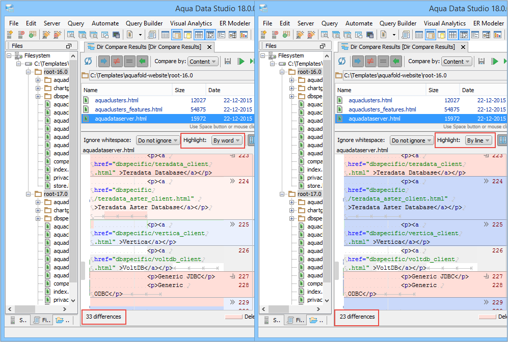 . The contents of the selected file are shown in the lower pane, also known as the Differences pane with the differences highlighted. This pane is further split into a split-pane where each file takes up half of the pane and shows connecting splines for identifying where the deletions, changes and additions occur. Comparisons show the character differences in a modified line with bolding and background color highlights indicate modified blocks. If they are not identical they are highlighted by default in pink (deleted), purple (changed) or green (added). These colors can be changed from the Options dialog. You can also use this tool to synchronize the contents of the directories