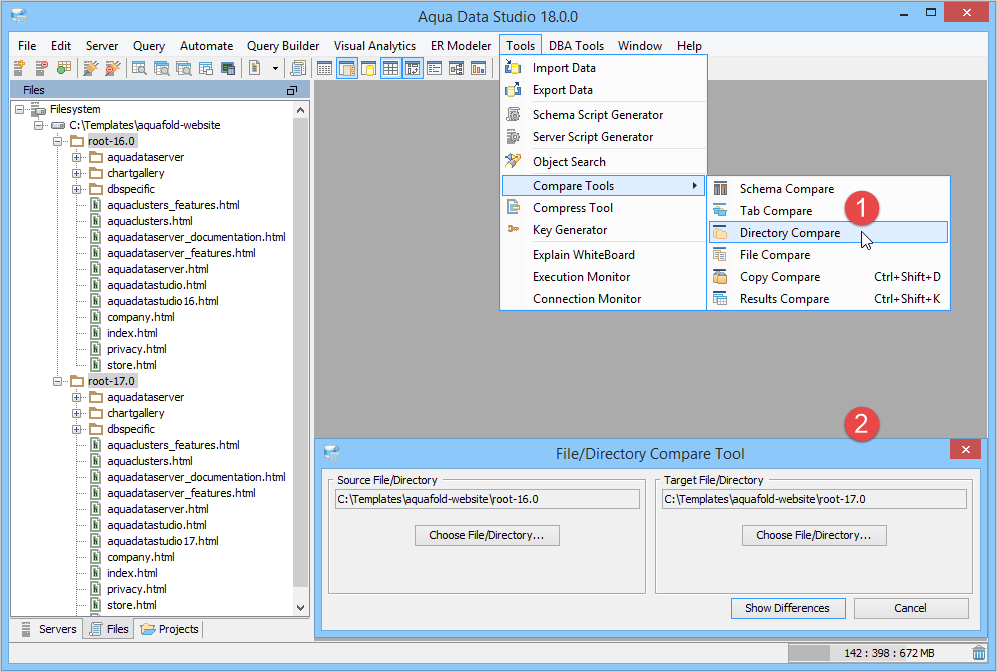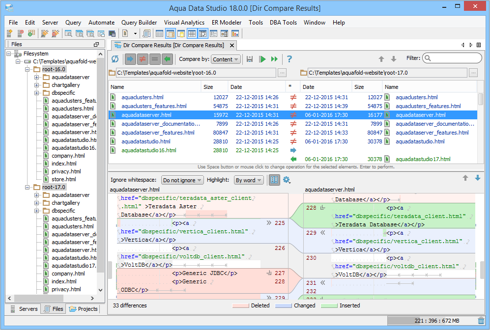 Directory Compare provides a method of identifying differences between contents of the directories and supports synchronizing selected or all differences of the selected files.