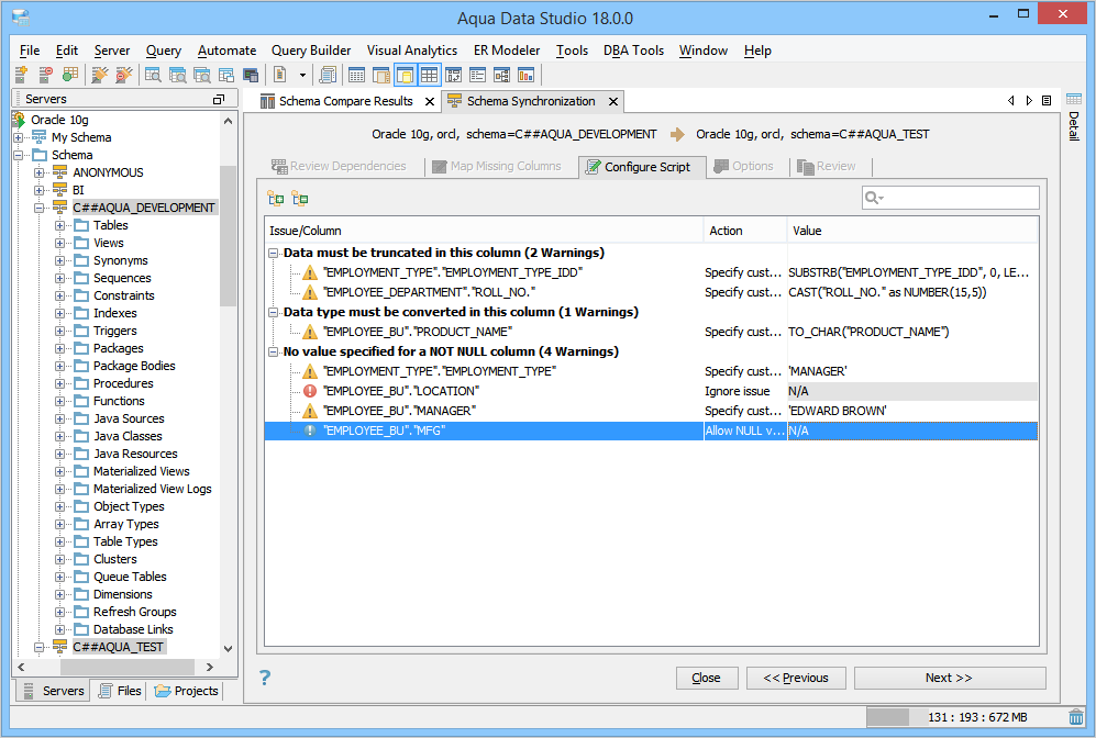 For the Oracle Database Server, to compare and synchronize changes from the C##AQUA_DEVELOPMENT (source) schema to the C##AQUA_TEST (target) schema, perform these steps.