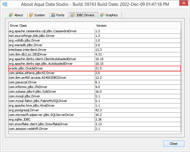 Aqua Data Studio is bundled with the Oracle 21c JDBC drivers. Oracle has discontinued support for Oracle 8i and 9i in their Oracle 21c drivers. Aqua Data studio still supports Oracle 8i and 9i, but you need to backdrop the Oracle drivers from 21c to 10g. Below are the instructions to backdrop to Oracle 10g drivers.