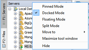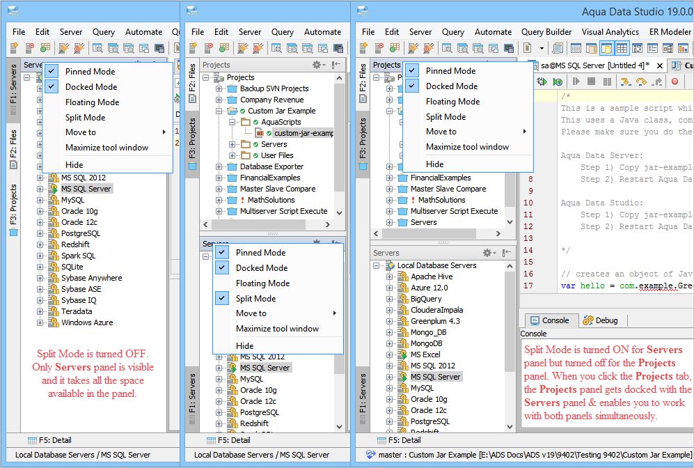 Dockable panels are supported in the following areas of Aqua Data Studio: