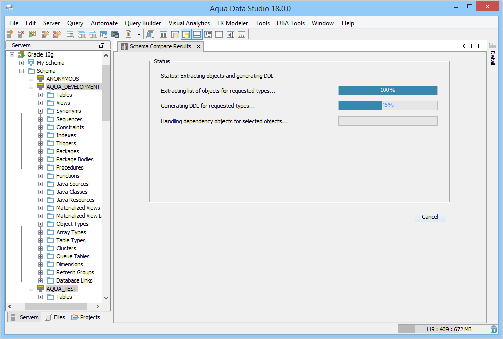 If you click Cancel this operation, the Schema Compare Results dialog is displayed. You can choose to cancel the current compare operation, abort and start a new compare, or continue with the existing compare operation.