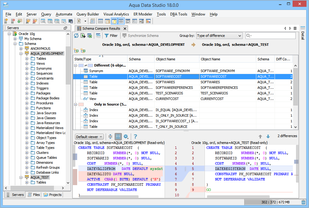 On selecting an object, you can view the source and target differences in different color codes in the SQL Differences pane. The script differences are shown in the default viewer where the source and target scripts are positioned side-by-side.