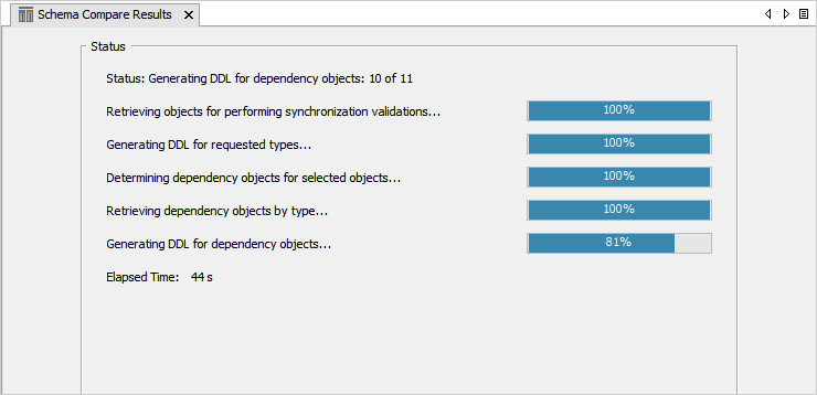 The schema compare status in the Schema Compare Results tab is tool-dependent.