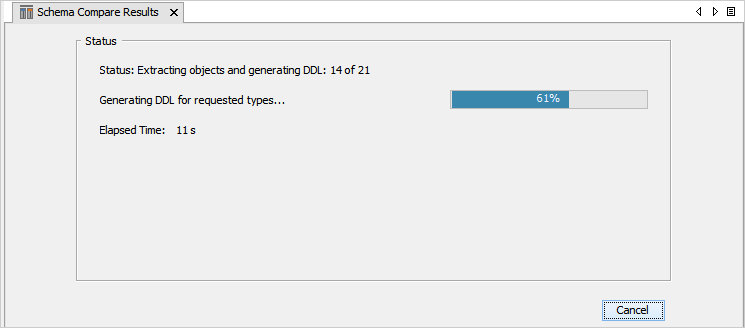 If you click Cancel this operation, the Schema Compare Results dialog is displayed. You can choose to cancel the current compare operation, abort and start a new compare, or continue with the existing compare operation.