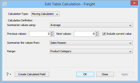 Moving Calculation - Summarize Values using: [selected function: Average] - Summarize Values from: [selected dimension: Sales Reason] - Range: [Product Category]