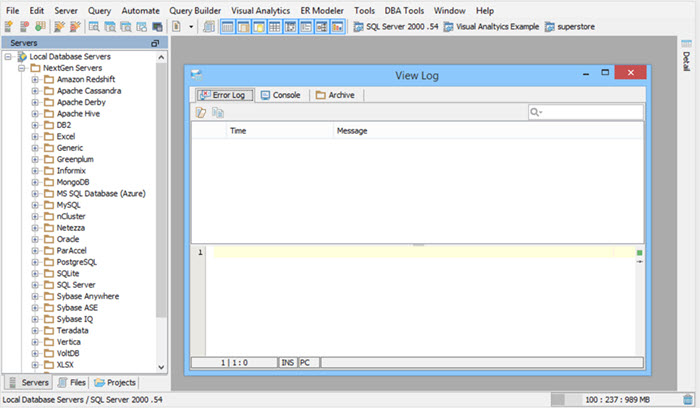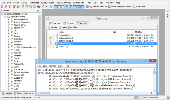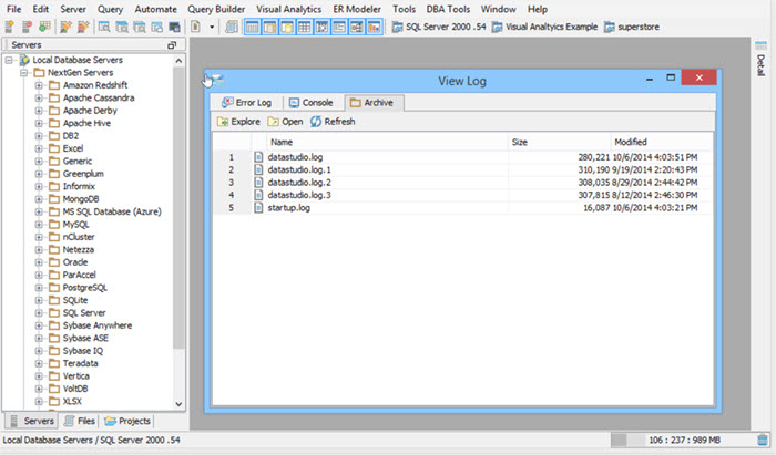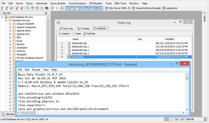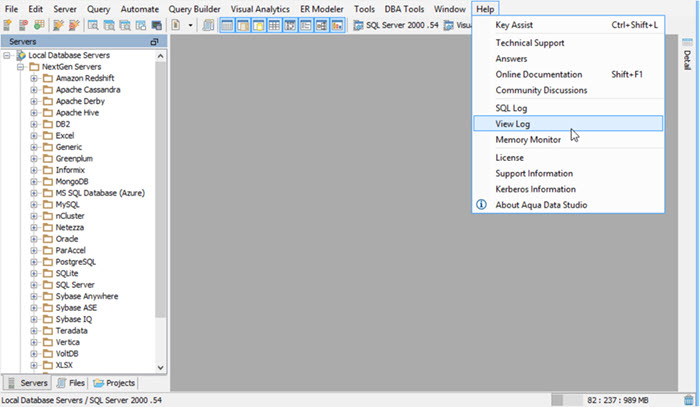 The View Log window provides three tabs for examining logs, errors and actions taken by Aqua Data Studio. This is useful for troubleshooting issues and support questions, and monitoring server connection status. The Logs and Support information can be found under the main application menu item Help